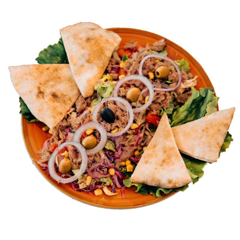 Tuna – tuna, zelena salata, paradajz, krastavac, kukuruz, masline, dresing.